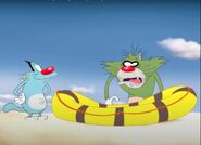 Without any more ideas to get off the island, Jack starts crying, awakening Oggy. Oggy then makes a rubber raft, freaking out Jack & making him take the raft. The 2 cats row their way off the island. Oggy, looking through binoculars, sees an airplane up above. Oggy pulls out a rocket to try & fly towards the rocket, lights it with a windproof lighter (A match in revised version) to sets it on fire, but, without notice, accidentally points the rocket down, causing it & rocket downward into the raft, creating a hole & into the ocean, causing the 2 cats to sink into the ocean. However, they're soon caught by the roach eater in his boat with a net.
