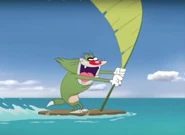Later, Oggy eats, but Jack comes in the scene with wood & a palm leaf. Jack then uses it as raft/sailboat/surfboard, starts to fly into the air & into storm clouds, but is soon electrocuted by a lightning bolt & falls back onto the island, burnt. Oggy roasts a shrimp on his back. the cockroaches laugh again, but they hear a whistle, causing them to go find who made that whistle. Then, behind a chopped tree stump, they see three fingers from the roach eater disguised as three hula cockroaches, which they fall in love with. They rush to them, but are then squashed by the roach eater's hand.